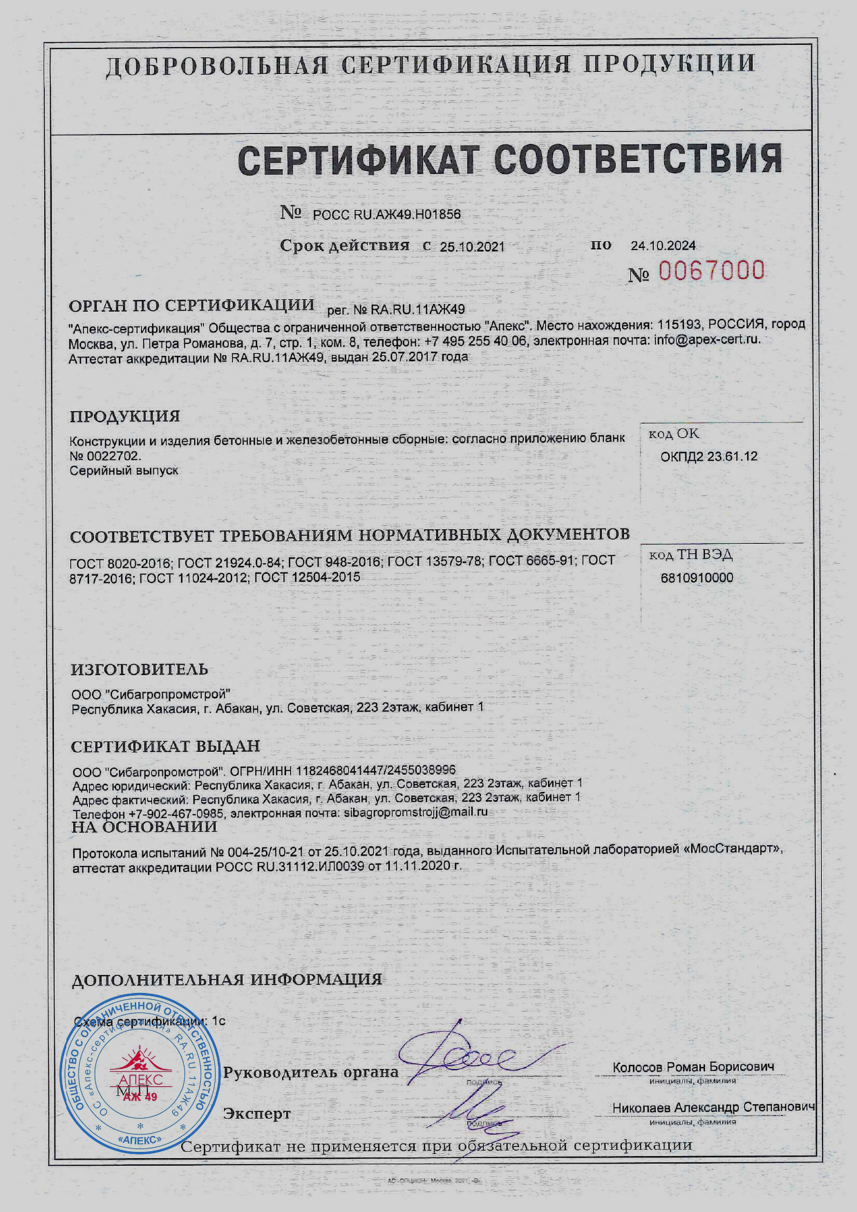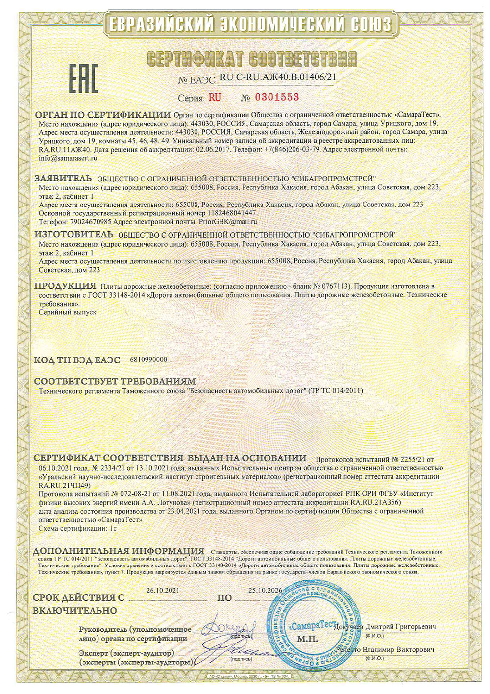 Сертификат Таможенного союза ТР ТС 014/2011 ООО «Сибаргопромстрой» 2021-2026